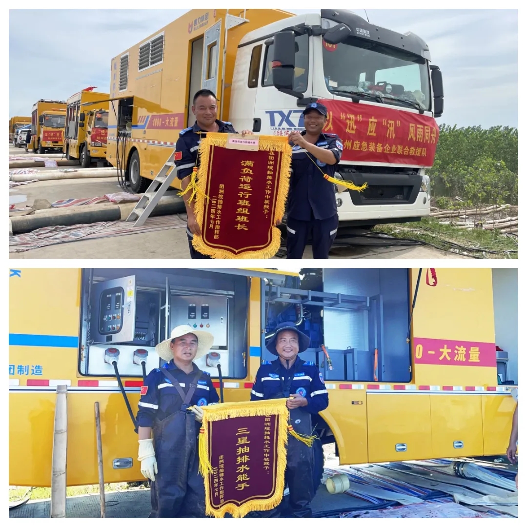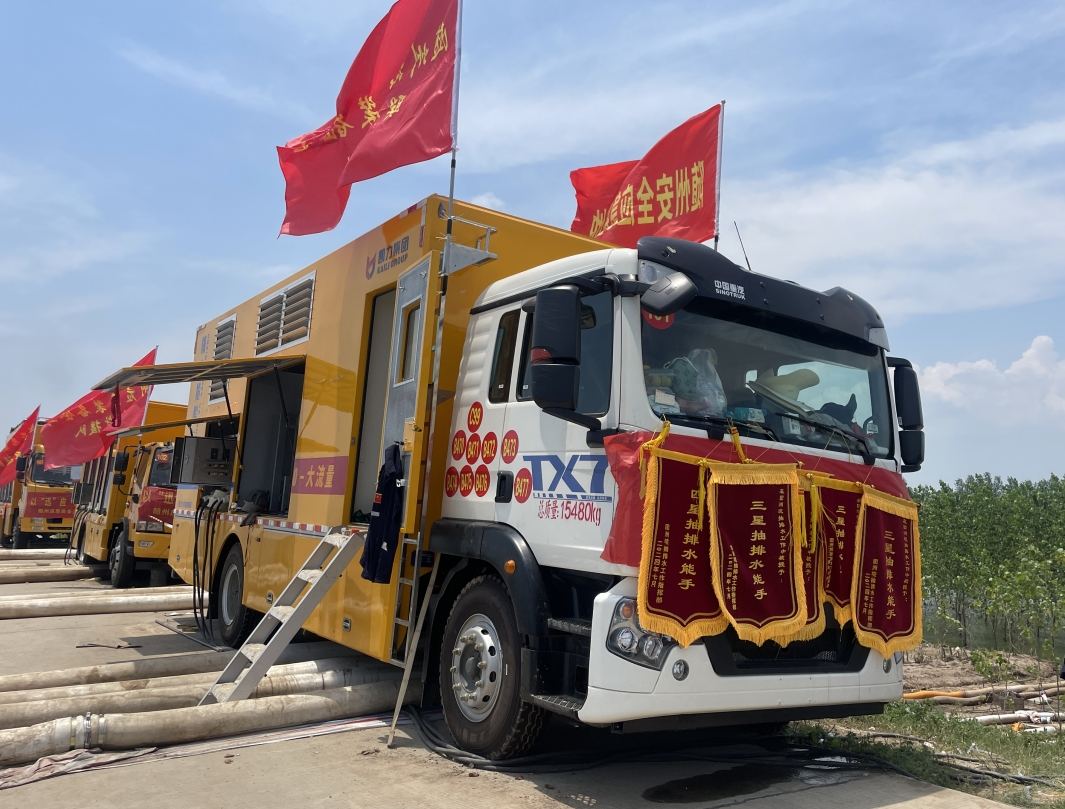 7月9日凌晨,凱力汽車集團緊急集結的兩臺大流量排水搶險車與隨州市應急裝備聯(lián)合救援隊一起星夜趕往華容縣災區(qū),參與排澇任務。