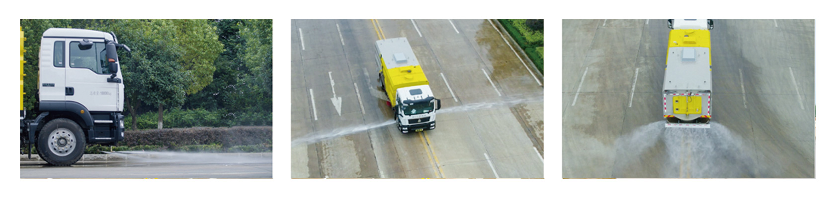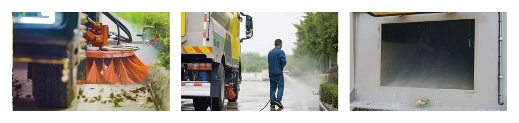 具有路面灑水、沖洗、掃路、清洗、降塵等多種功能。同時配有高壓水槍可對道路衛(wèi)生死角、牛皮癬及車輛自身進行清潔作業(yè)采用“中置兩掃盤+中置寬吸嘴+內(nèi)置高壓主噴桿+左右高壓側(cè)噴桿”布置,小流量高壓水泵,左右噴桿V形布置和吸嘴內(nèi)置主噴桿無間隙高壓噴嘴噴水,洗凈率高、作業(yè)速度快。