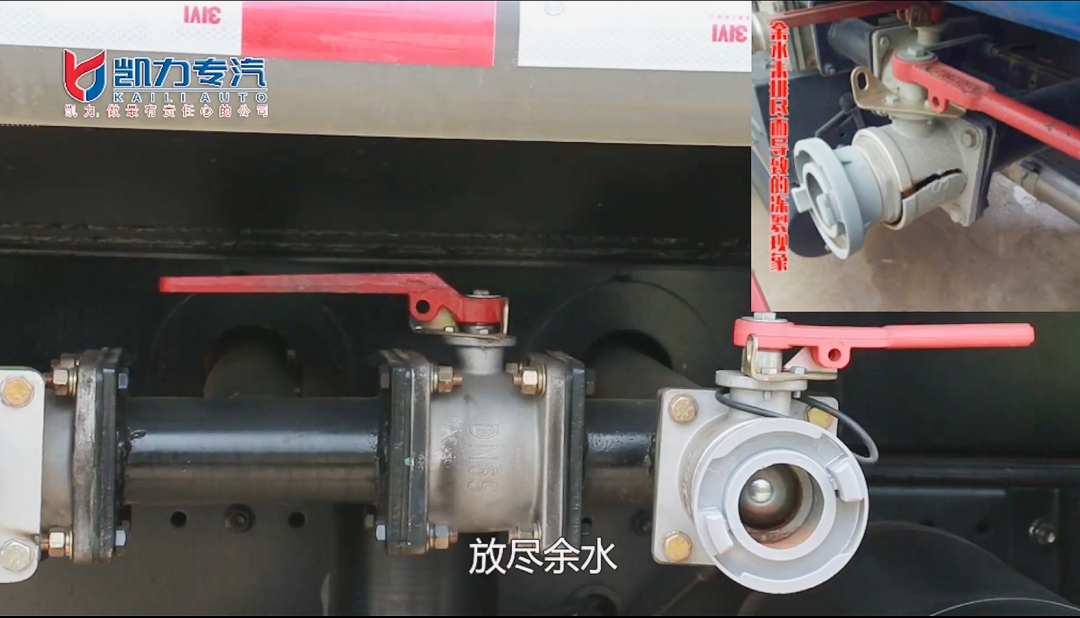 4、整車水路系統(tǒng)無防凍裝置,在寒冷天氣情況下使用后,應立即將水泵、水罐及水路系統(tǒng)中的余水全部放凈,防止水泵凍裂;同時將工作球閥全部打開,放凈余水,防止閥門、管道凍裂。