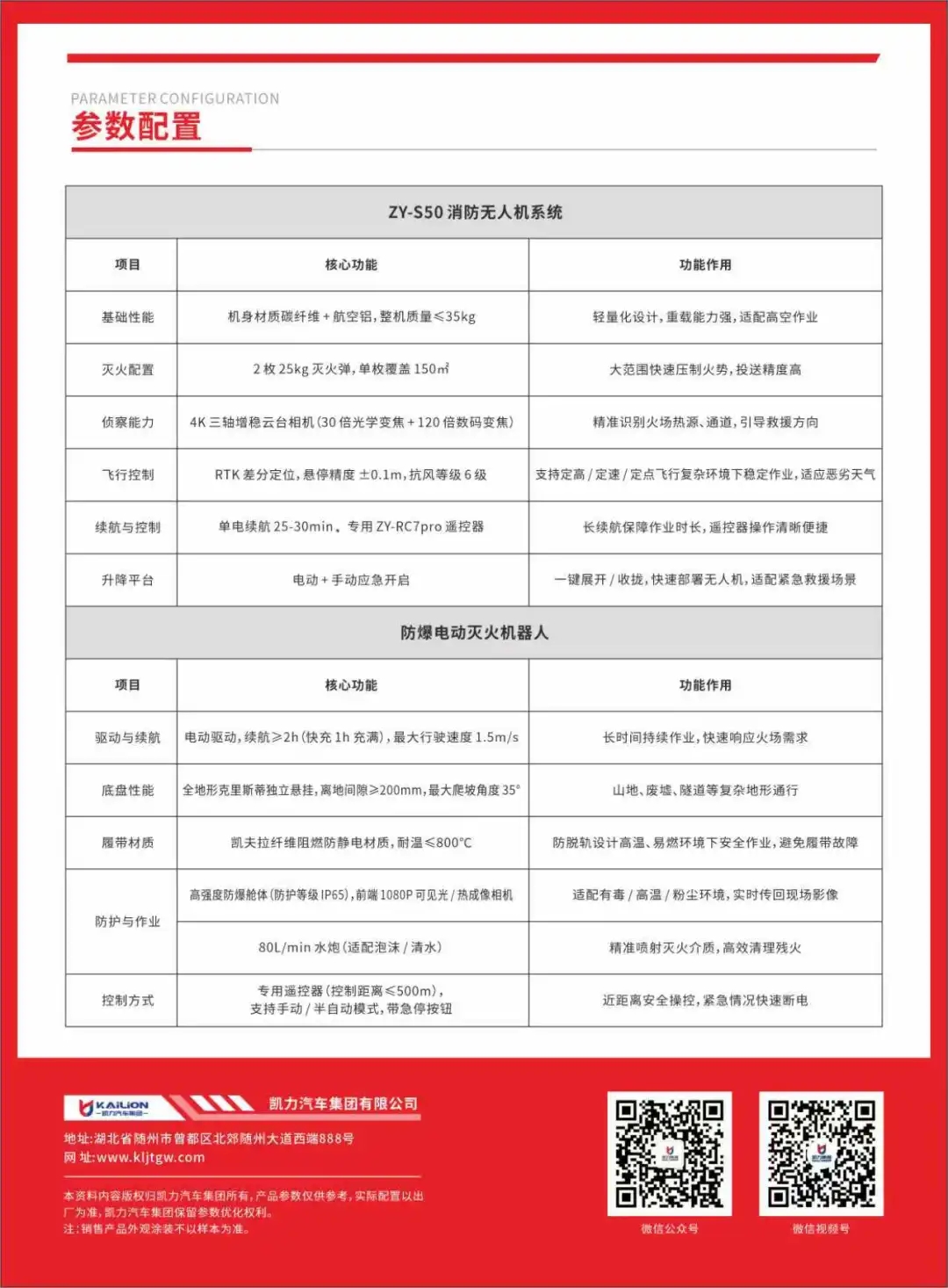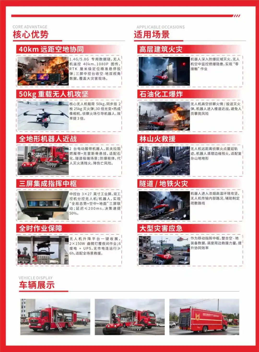 凱力風(fēng)牌空地一體無(wú)人滅火綜合救援車,集成“無(wú)人機(jī)空中滅火救援+機(jī)器人地面協(xié)同作戰(zhàn)+指揮車遠(yuǎn)程調(diào)度指揮”于一體的消防應(yīng)急救援高端裝備,適用于對(duì)高層建筑、石油化工、森林山火等特殊火災(zāi)場(chǎng)景的綜合作戰(zhàn)。