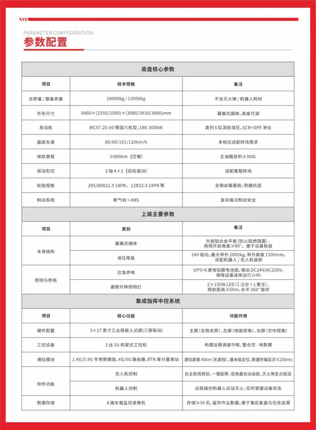 將重型消防無(wú)人機(jī)系統(tǒng)、移動(dòng)指揮中心、應(yīng)急供電單元、現(xiàn)場(chǎng)照明系統(tǒng)等功能集成于一車,通過車載監(jiān)控和多功能喊話器,曲臂車載升降照明燈和智能升降臺(tái)的靈活設(shè)計(jì),顯著提升救援效率與保障人員安全。