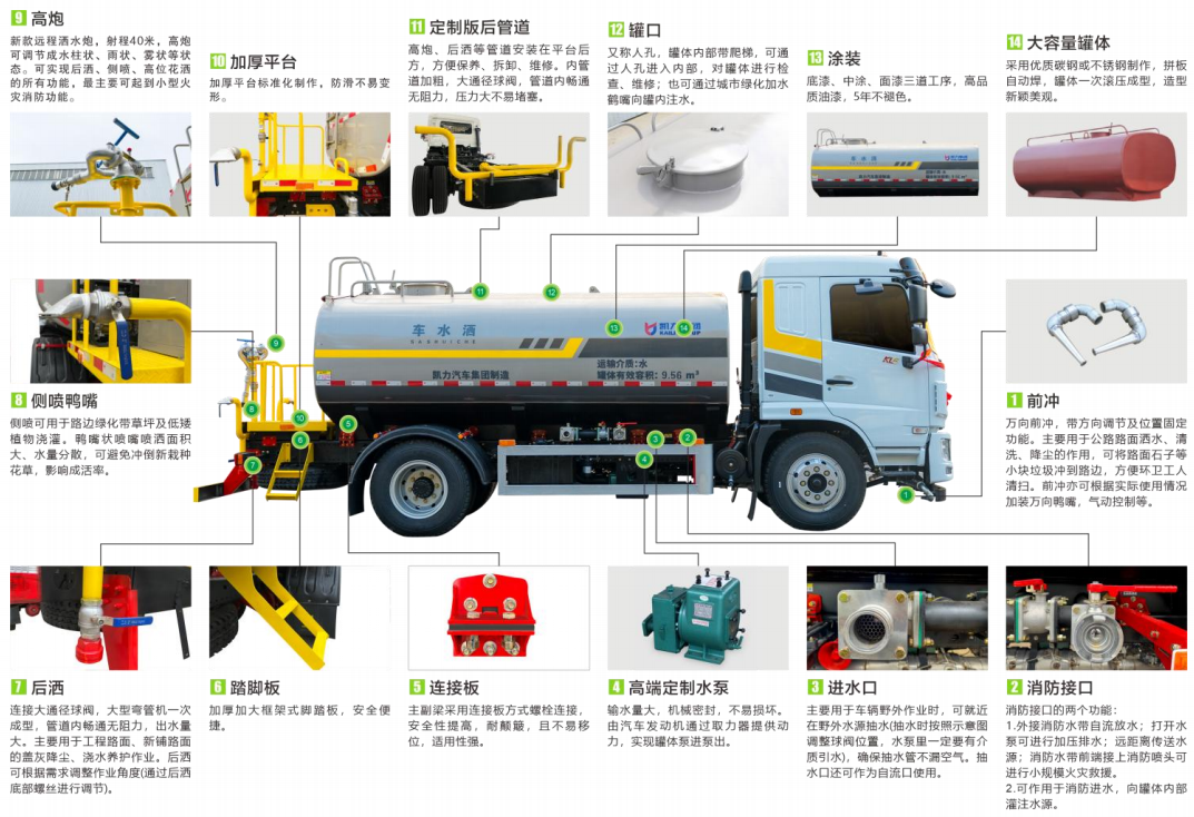 升級(jí):管道、細(xì)節(jié)、設(shè)計(jì)全面升級(jí),采用定制版大功率水泵,前沖可達(dá)雙向8車道、后灑可達(dá)雙向4車道,高炮可達(dá)40米,罐體與副梁采用連接板螺栓連接,不易移位更牢固安全。
