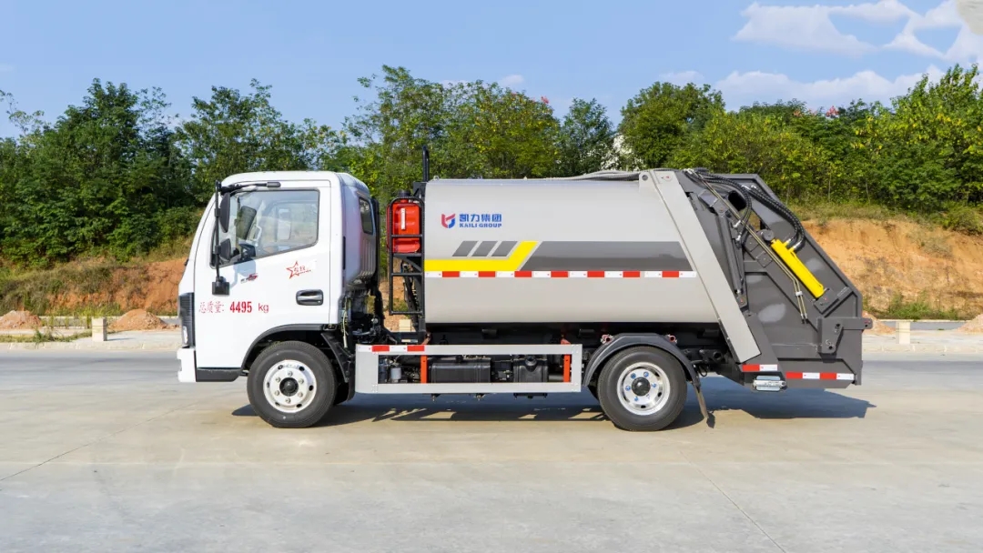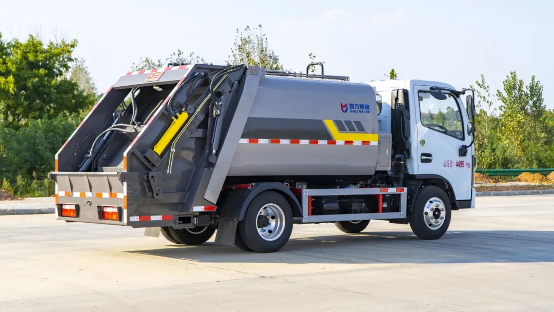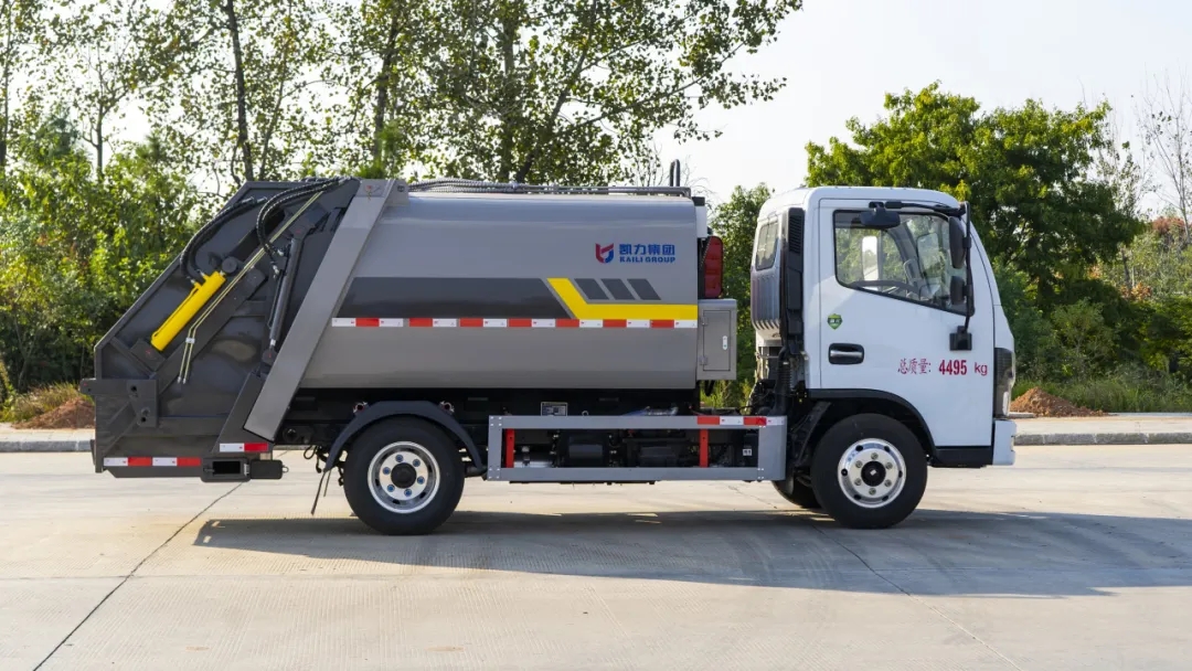 凱力KLF5042ZYSE6型5.8方壓縮垃圾車,基于東風多利卡D5底盤(軸距2950mm)開發(fā),搭載全柴132國VI柴油機(97kW),專為大容量垃圾轉(zhuǎn)運設(shè)計。